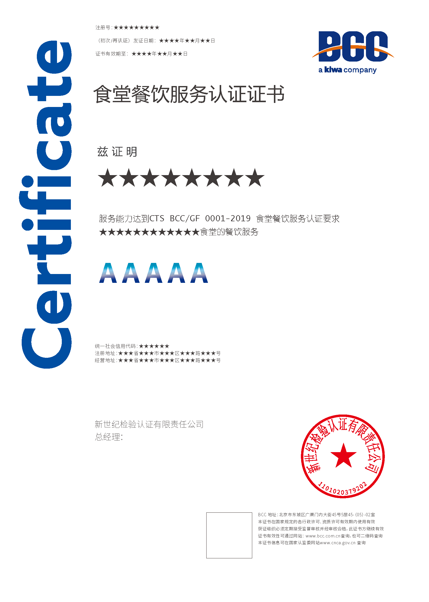 食堂餐飲服務認證的依據是RB/T 309-2017《餐飲服務認證要求》,以及新世紀內部技術規(guī)范CTS BCC/GF 0001-2019《食堂餐飲服務認證要求》。主要針對機關、學校等企事業(yè)單位供應其內部職工、學生等就餐的場所進行認證。