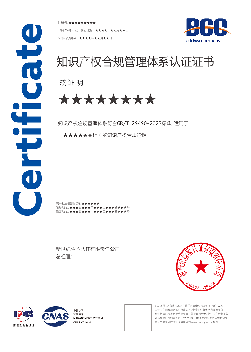 Kiwa BCC是首批獲CNAS認可的知識產權認證機構,可為企業(yè)頒發(fā)帶有“CNAS”標識的知識產權管理體系認證證書。認證所用標準包括:GB/T 29490-2023《企業(yè)知識產權合規(guī)管理體系要求》、GB/T33250-2016《科研組織知識產權管理規(guī)范》、GB/T33251-2016《高等學校知識產權管理規(guī)范》。