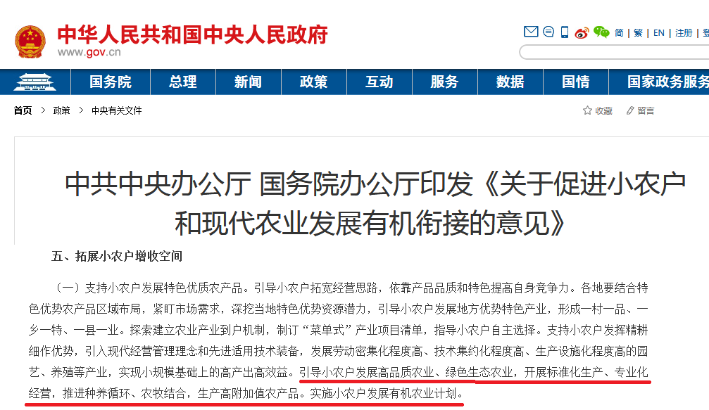 其中意見描述:“引導(dǎo)小農(nóng)戶發(fā)展高品質(zhì)農(nóng)業(yè)、綠色生態(tài)農(nóng)業(yè),開展標(biāo)準(zhǔn)化生產(chǎn)、專業(yè)化經(jīng)營,推進(jìn)種養(yǎng)循環(huán)、農(nóng)牧結(jié)合,生產(chǎn)高附加值農(nóng)產(chǎn)品。實(shí)施小農(nóng)戶發(fā)展有機(jī)農(nóng)業(yè)計(jì)劃。”