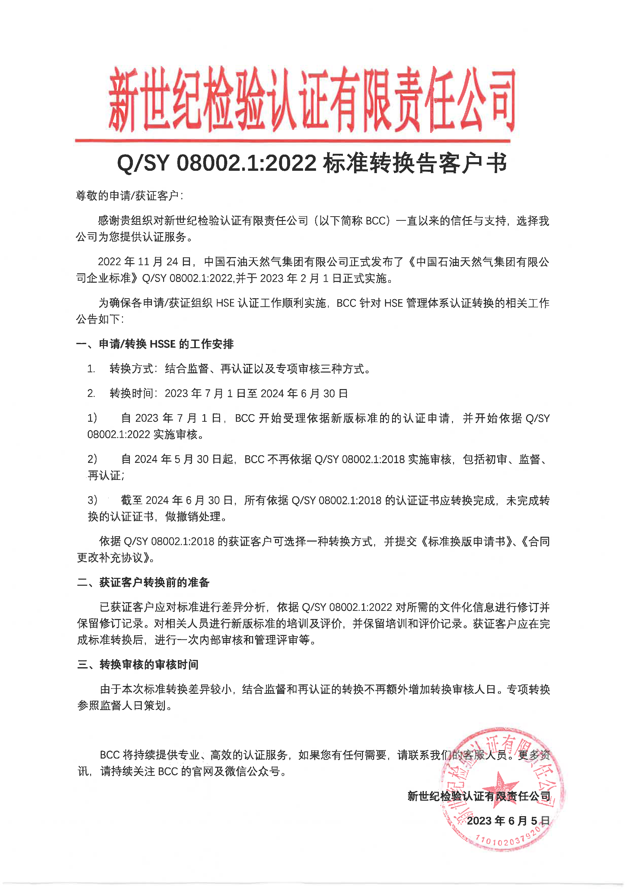 Q/SY 08002.1:2022標(biāo)準(zhǔn)轉(zhuǎn)換告客戶(hù)書(shū)
