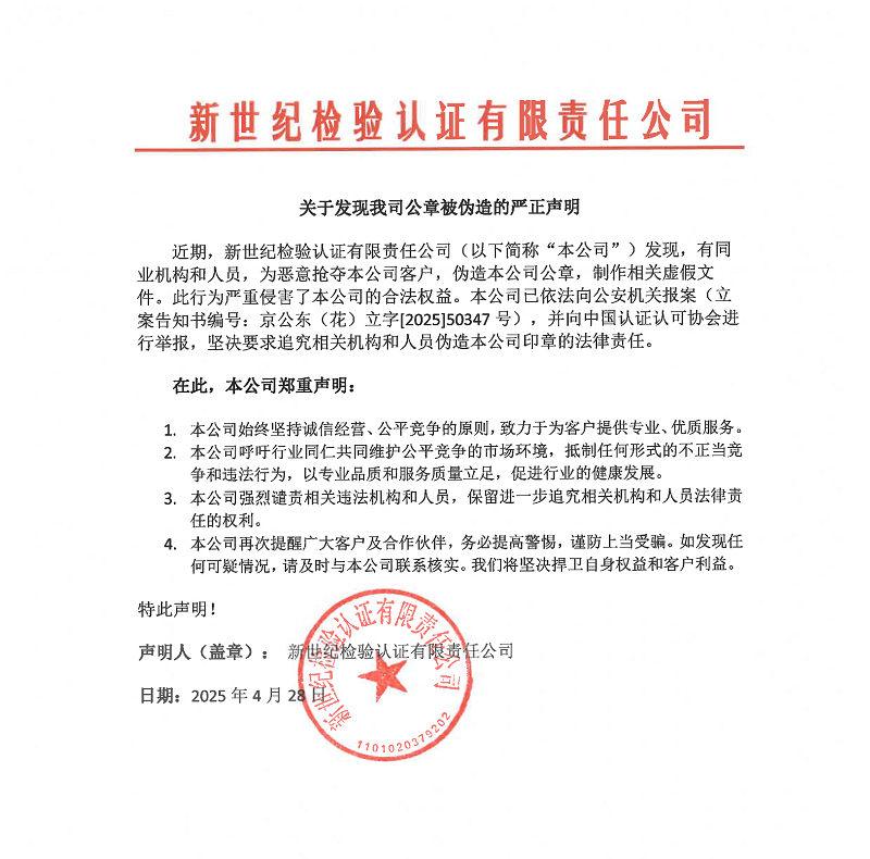 近期,新世紀(jì)檢驗認(rèn)證有限責(zé)任公司(以下簡稱 “本公司 ” )發(fā)現(xiàn),有同業(yè)機(jī)構(gòu)和人員,為惡意搶奪本公司客戶,偽造本公司公章,制作相關(guān)虛假文件。此行為嚴(yán)重侵害了本公司的合法權(quán)益。本公司已依法向公安機(jī)關(guān)報案(立案告知書編號: 京公東(花)立字[2025]50347號),并向中國認(rèn)證認(rèn)可協(xié)會進(jìn)行舉報,堅決要求追究相關(guān)機(jī)構(gòu)和人員偽造本公司印章的法律責(zé)任。