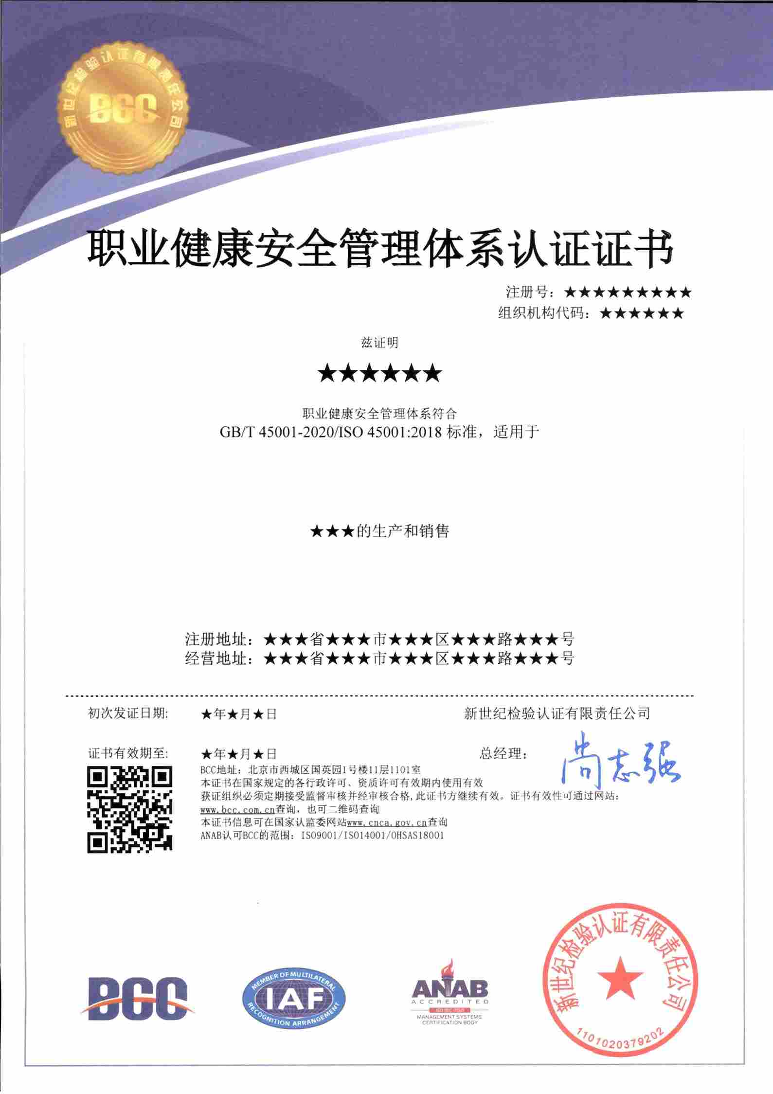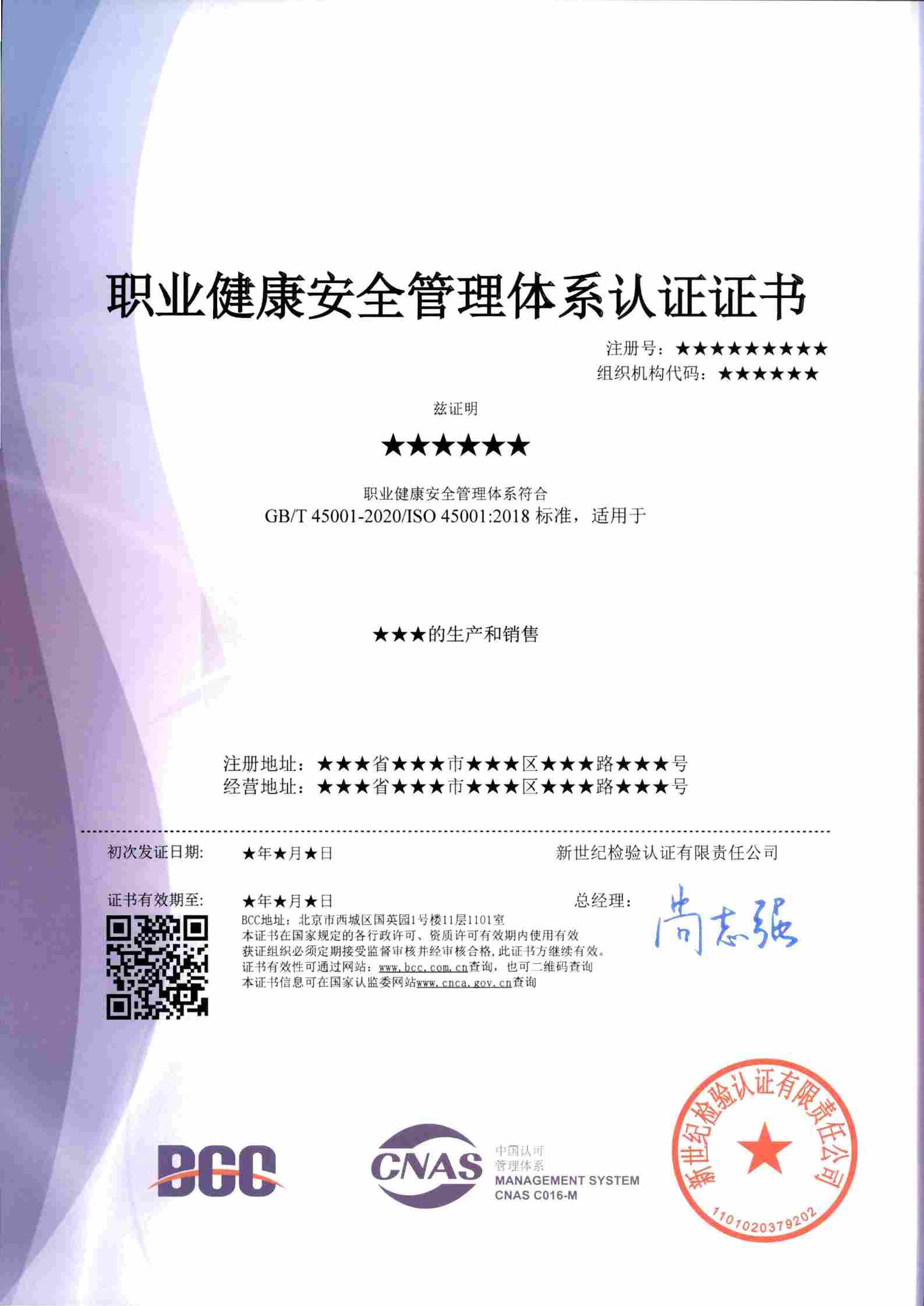 職業(yè)健康安全管理證書(CNAS)