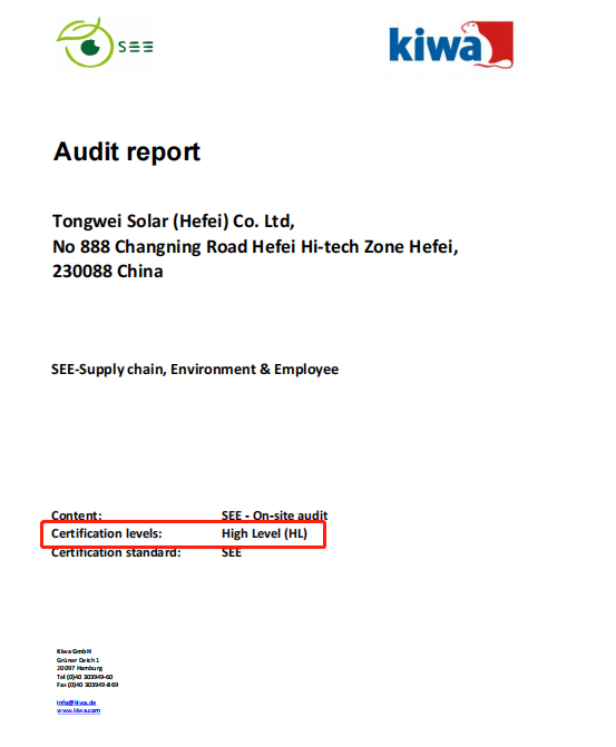 作為全球認證領(lǐng)域20強企業(yè),Kiwa集團專家與Kiwa BCC專家對企業(yè)進行了現(xiàn)場審核、通過員工訪談,以及文件評審等工作,最終為通威太陽能頒發(fā)了首份依據(jù)SEE標準的ESG現(xiàn)場評估報告,并高度評價了通威太陽能在ESG管理方面的突出表現(xiàn)。報告涵蓋可持續(xù)的企業(yè)治理、供應鏈管理、員工權(quán)益、環(huán)境管理四個部分,總計約50個主題,在全球范圍內(nèi)有著較高且廣泛的客戶接受度和權(quán)威公信力。